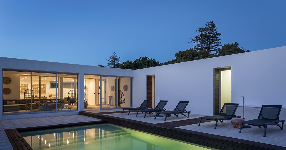 The master bedroom boasts unrivalled views over the pool, with sliding glass doors allowing you to wake up and slip seamlessly into the gorgeous Portuguese sunshine. The heated pool has sun loungers for everyone and evening lights, making it appealing 24/7 and ascertaining that there is space for everyone to chill around it. The wide terrace surrounding the pool is bordered by luscious green flower beds sprouting pine trees and exotic flowers. The noise of the sea will make you truly believe you have found paradise.